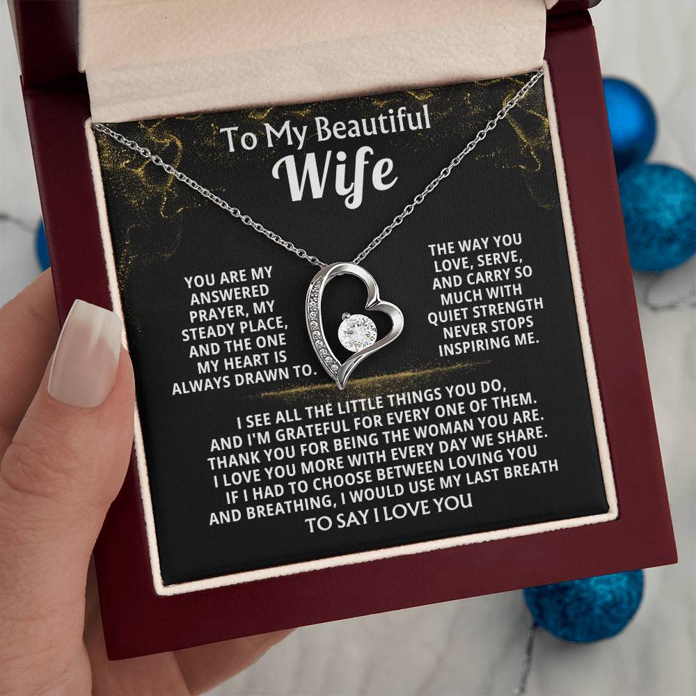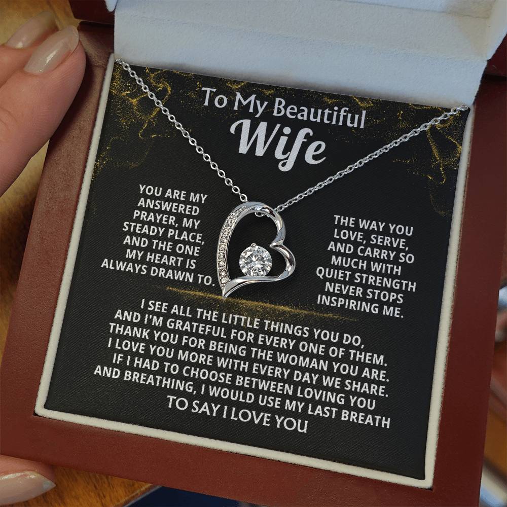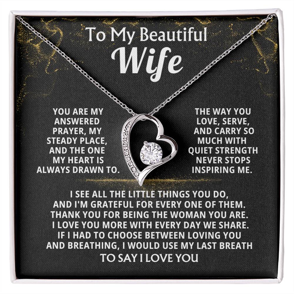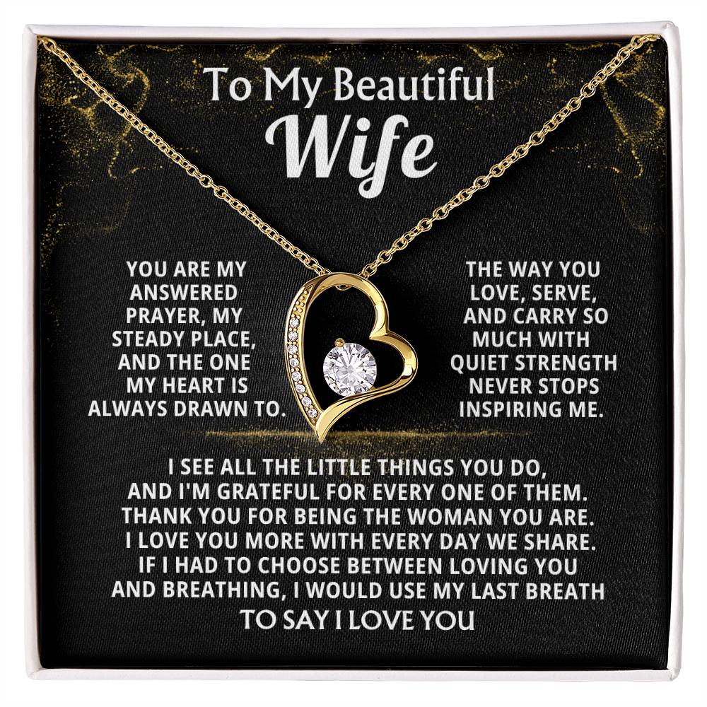 Quote On Card: To My Beautiful Wife, You are my answered prayer, my steady place, and the one my heart is always drawn to. The way you love, serve, and carry so much with quiet strength never stops inspiring me. I see all the little things you do, and I'm grateful for every one of them.Thank you for being the woman you are. I love you more with every day we share. If I had to choose between loving you and breathing, I would use my last breath to say I love you.