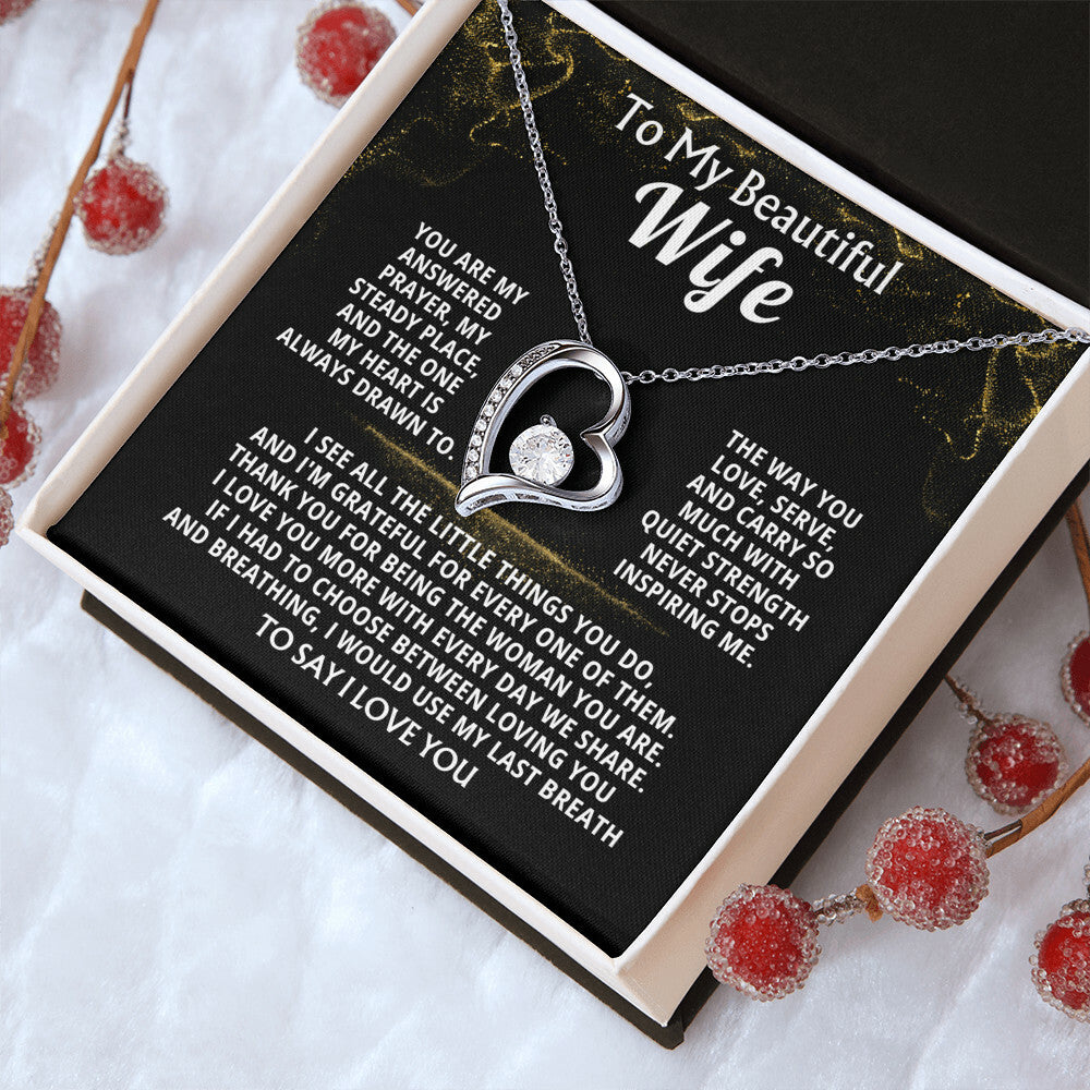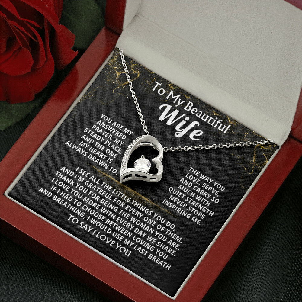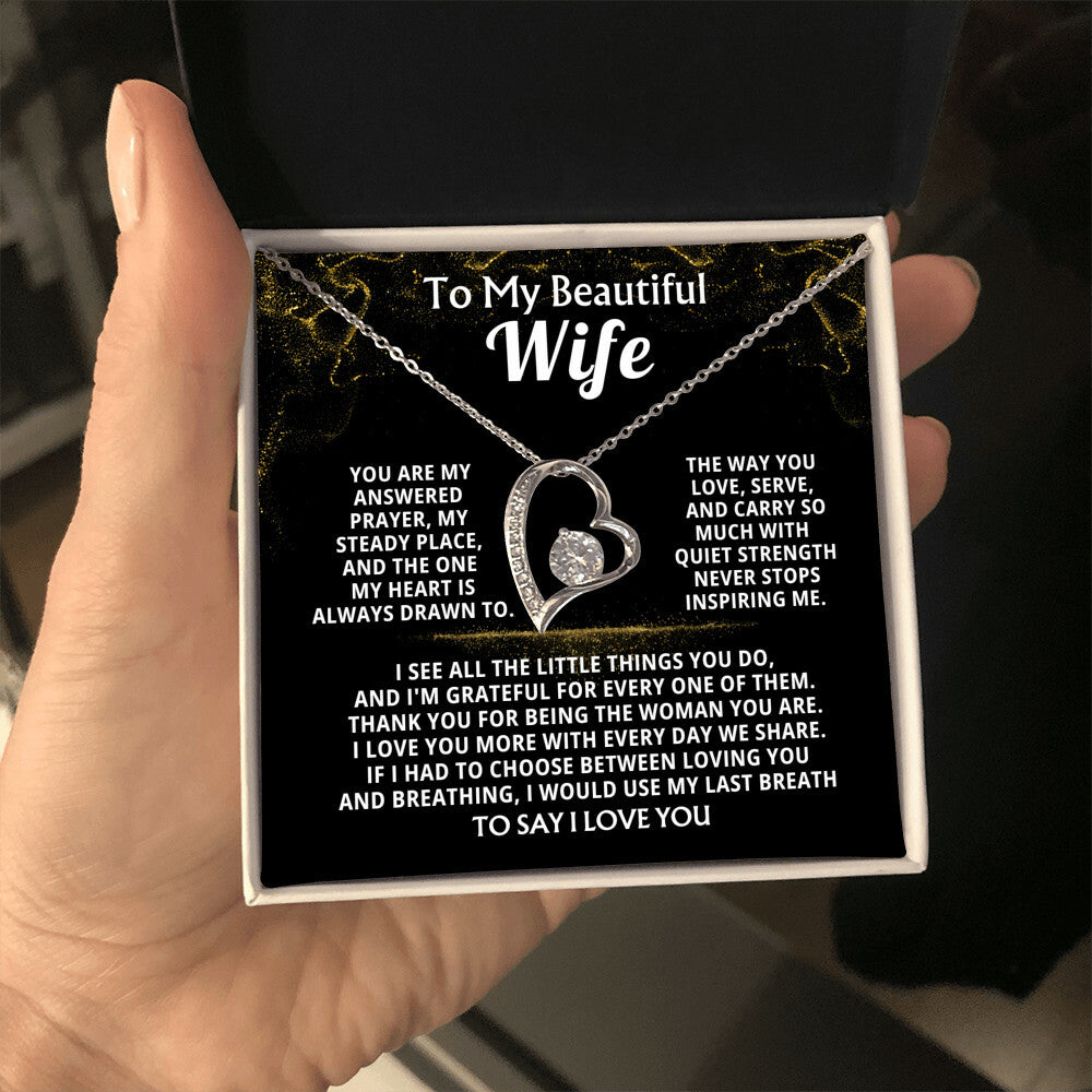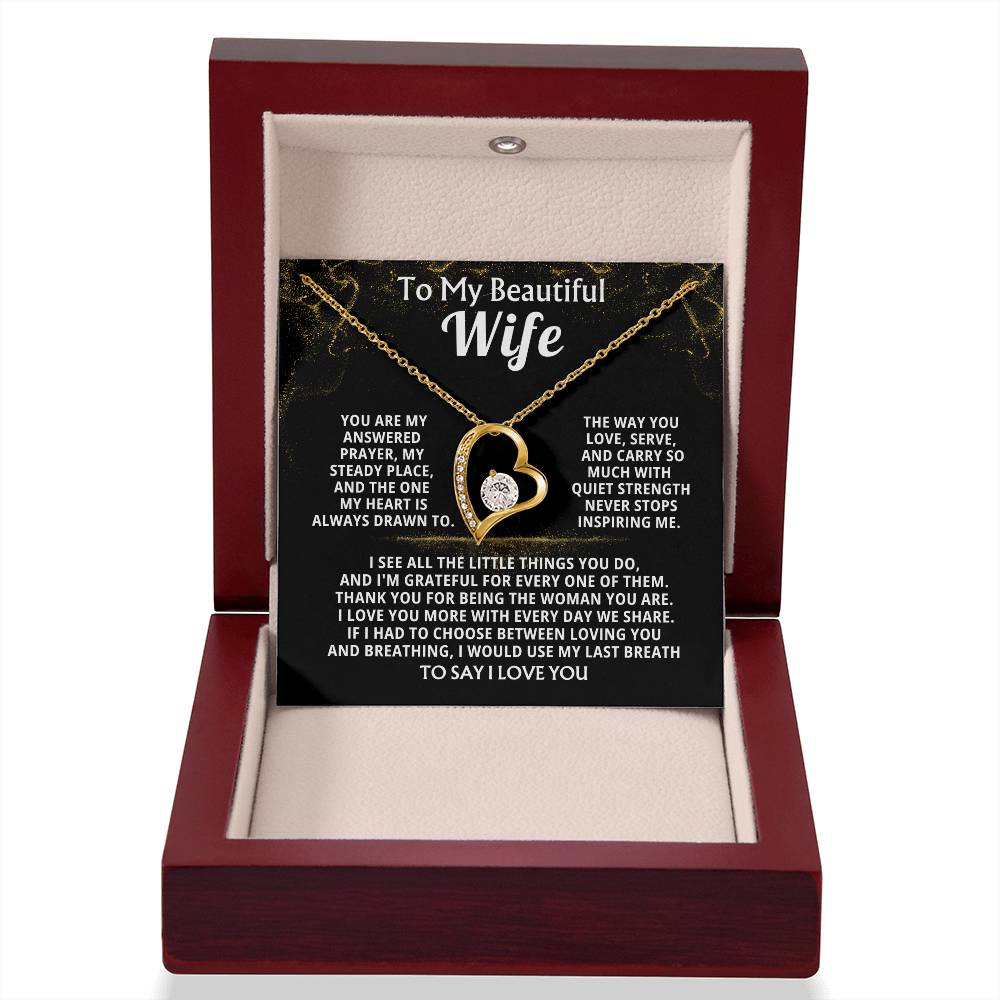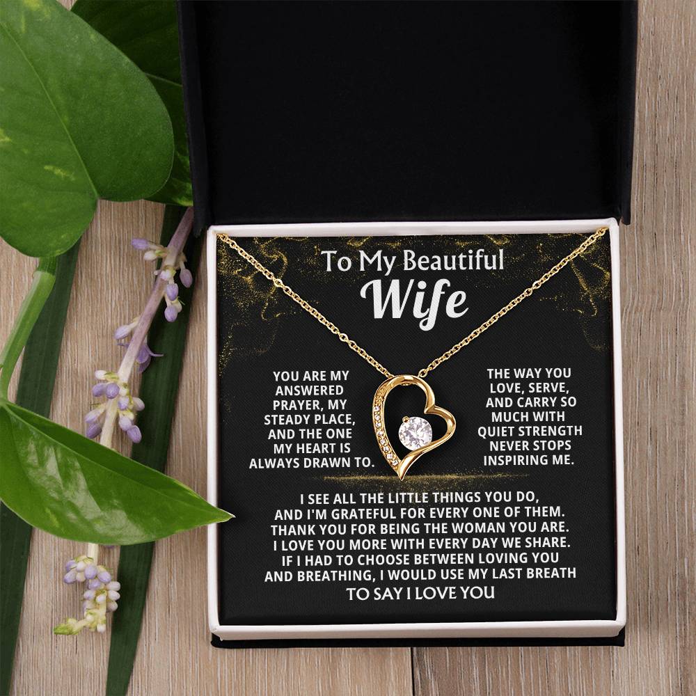 Quote On Card: To My Beautiful Wife, You are my answered prayer, my steady place, and the one my heart is always drawn to. The way you love, serve, and carry so much with quiet strength never stops inspiring me. I see all the little things you do, and I'm grateful for every one of them.Thank you for being the woman you are. I love you more with every day we share. If I had to choose between loving you and breathing, I would use my last breath to say I love you.