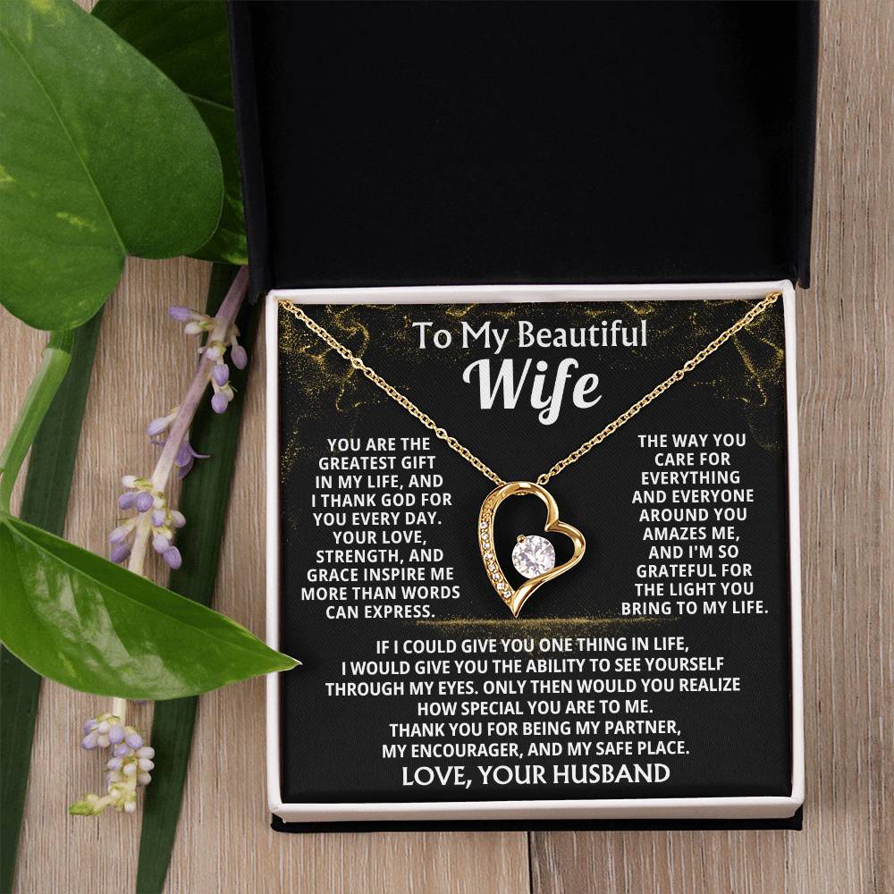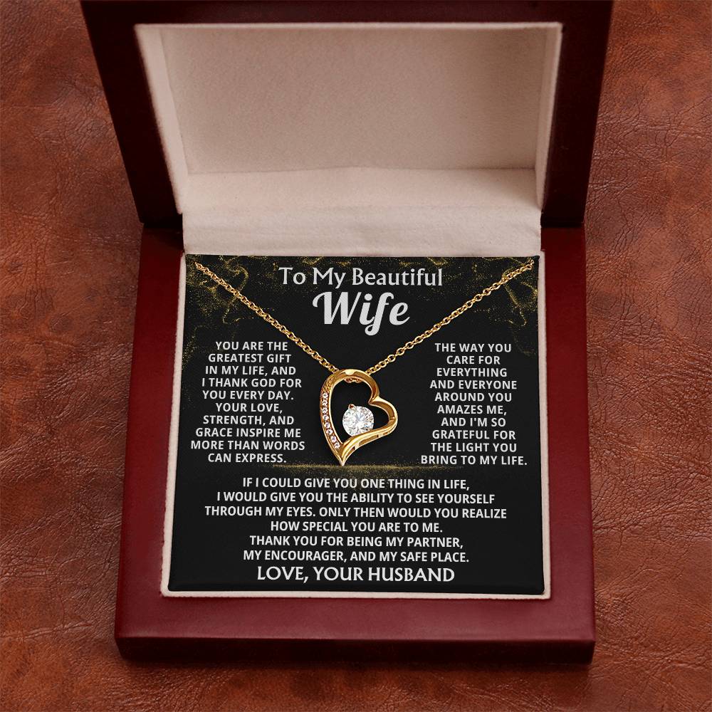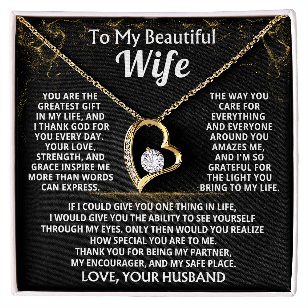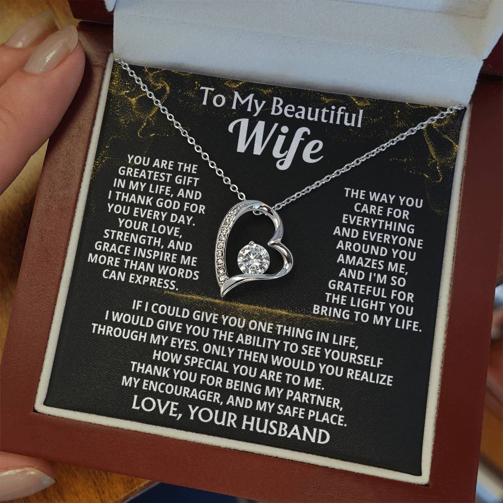 Quote On Card: To My Beautiful Wife, You are the greatest gift in my life, and I thank God for you every day. Your love, strength, and grace inspire me more than words can express. The way you care for everything and everyone around you amazes me, and I'm so grateful for the light you bring to my life, If I could give you one thing in life, I would give you the ability to see yourself through my eyes. Only then would you realize how special you are to me. Thank you for being my partner, my encourager, and my safe place.Love, Your Husband