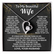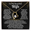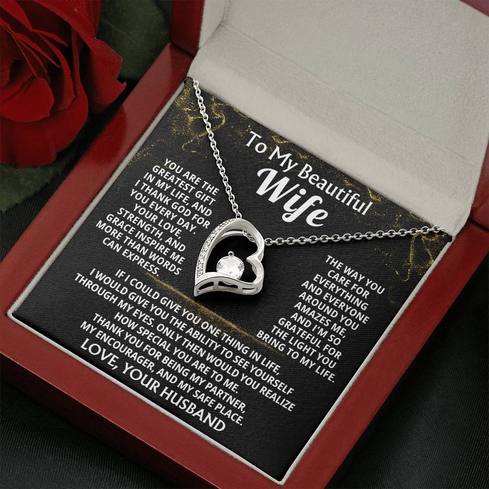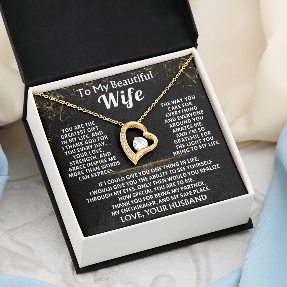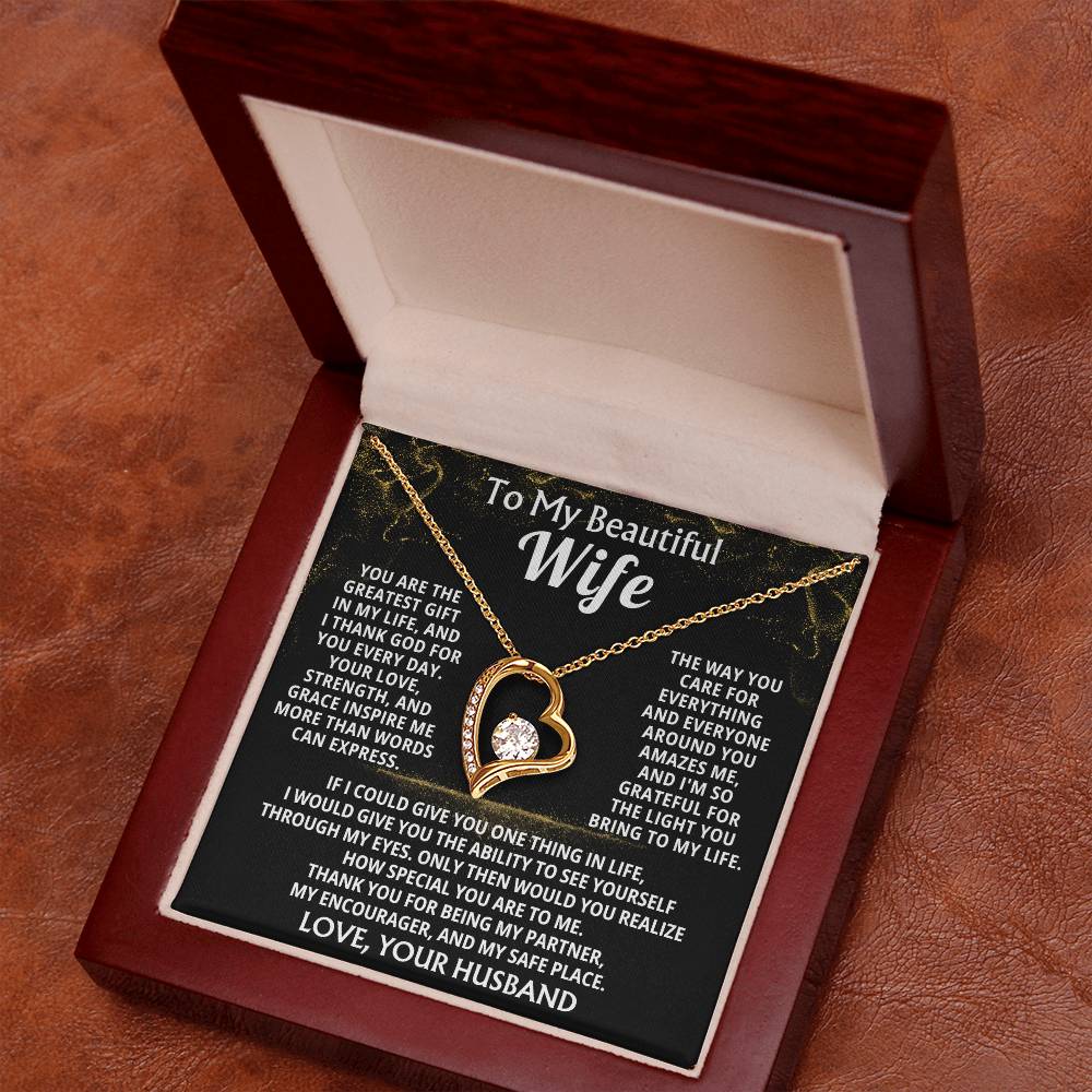 Quote On Card: To My Beautiful Wife, You are the greatest gift in my life, and I thank God for you every day. Your love, strength, and grace inspire me more than words can express. The way you care for everything and everyone around you amazes me, and I'm so grateful for the light you bring to my life, If I could give you one thing in life, I would give you the ability to see yourself through my eyes. Only then would you realize how special you are to me. Thank you for being my partner, my encourager, and my safe place.Love, Your Husband