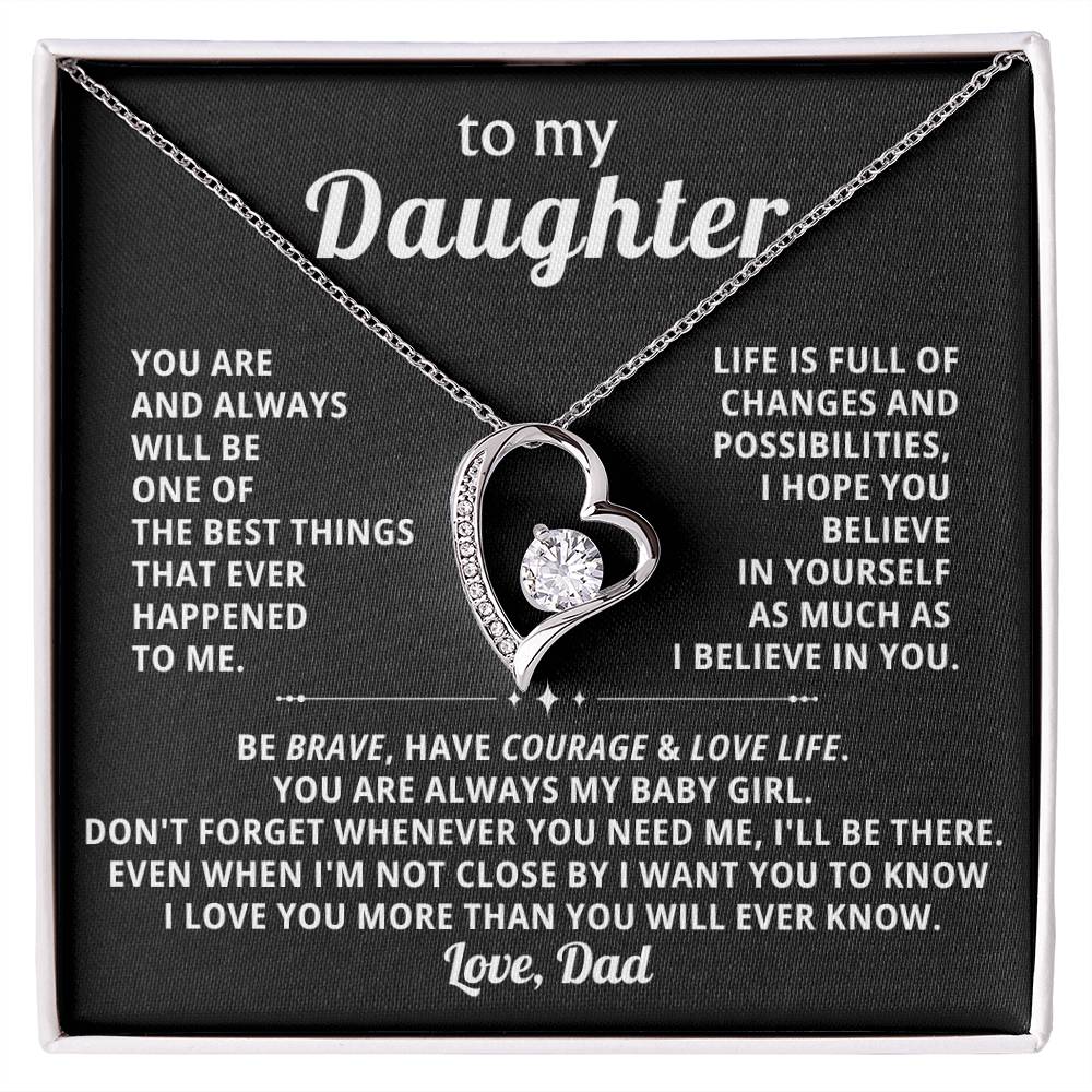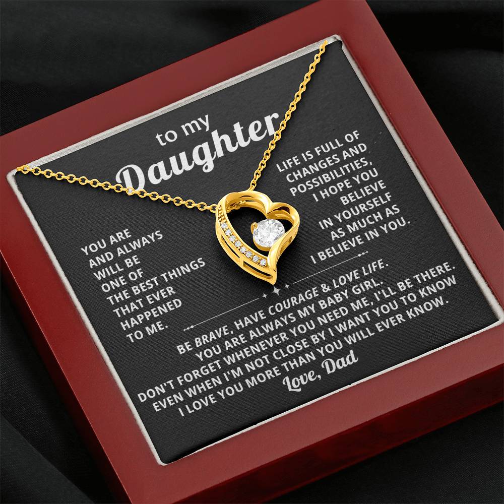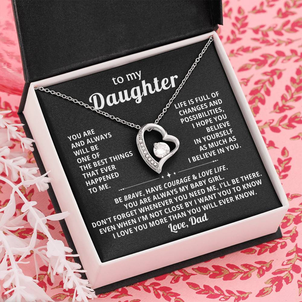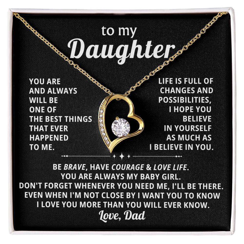 Quote On Card: TO MY BEAUTIFUL DAUGTHER - You are and always will be one of the BEST THINGS that ever happened to me. Life is full of changes and possibilities, I hope you believe in yourself as much as I believe in you. BE BRAVE, HAVE COURAGE & LOVE LIFE. You are always my baby girl. Don't forget whenever you need me, I'll be there. Even when I'm not close by I want you to know. I love you more than you will ever know.Love, Dad