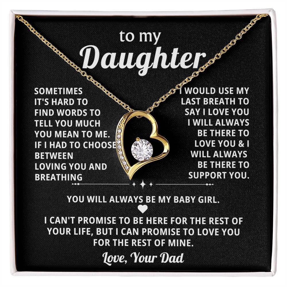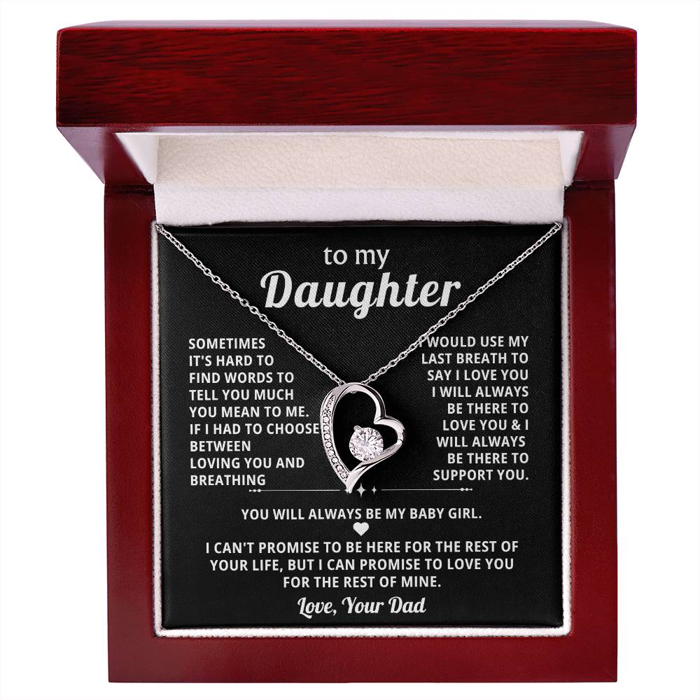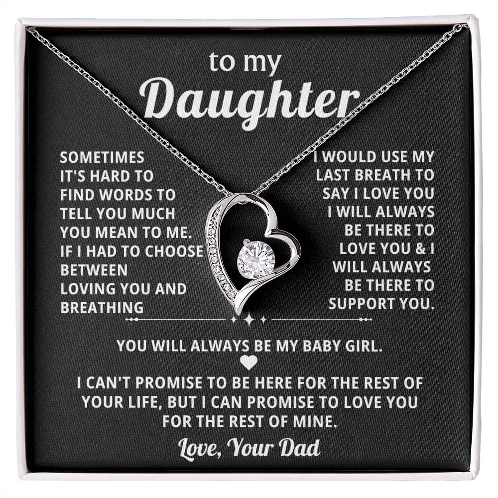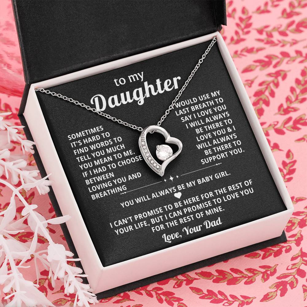 Quote On Card: To My Daughter, SOMETIMES IT'S HARD TO FIND WORDS TO TELL YOU MUCH YOU MEAN TO ME. IF I HAD TO CHOOSE BETWEEN LOVING YOU AND BREATHING .I WOULD USE MY LAST BREATH TO SAY I LOVE YOU . I WILL ALWAYS BE THERE TO LOVE YOU &I WILL ALWAYS BE THERE TO SUPPORT YOU YOU WILL ALWAYS BE MY BABY GIRL. I CAN'T PROMISE TO BE HERE FOR THE REST OF YOUR LIFE, BUT I CAN PROMISE TO LOVE YOU FOR THE REST OF MINE. Love, Your Dad