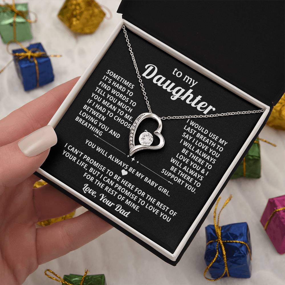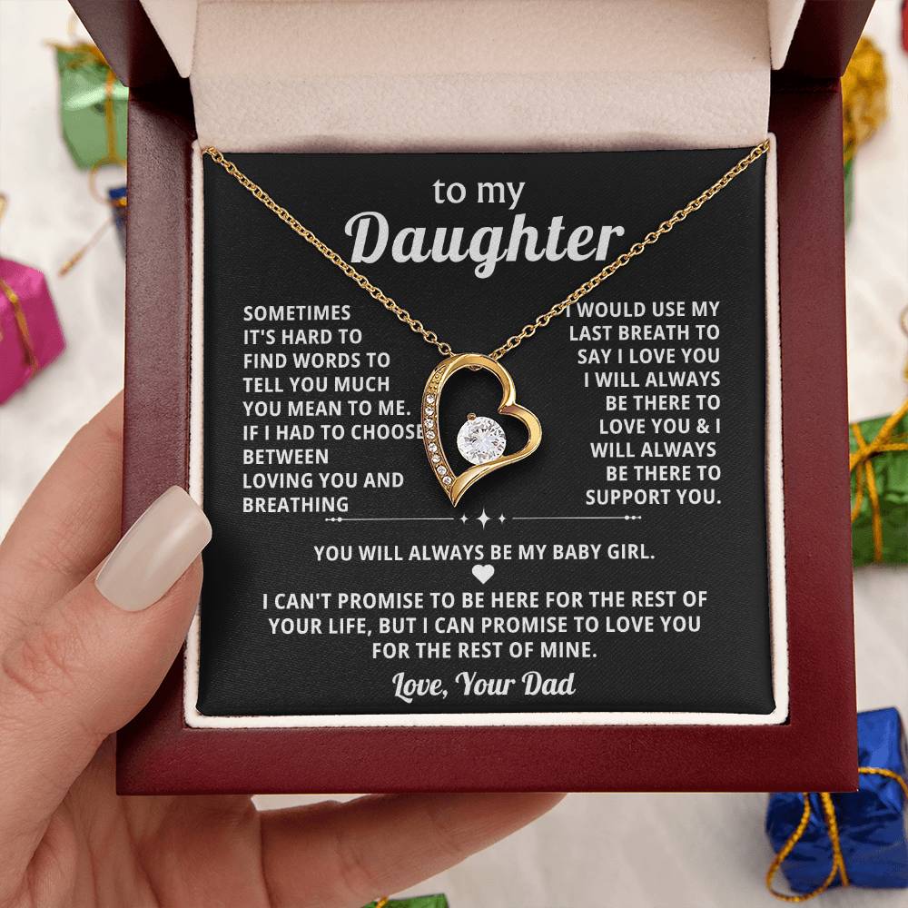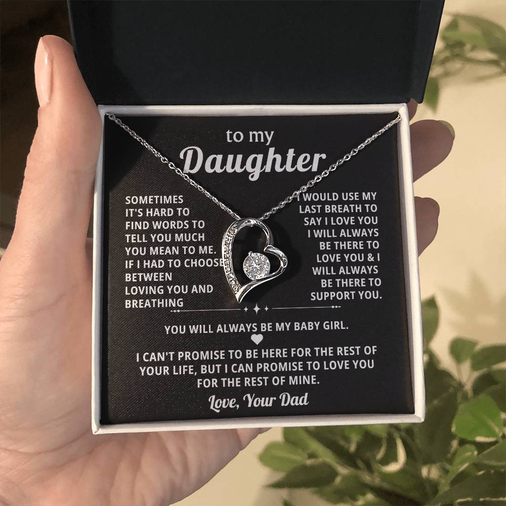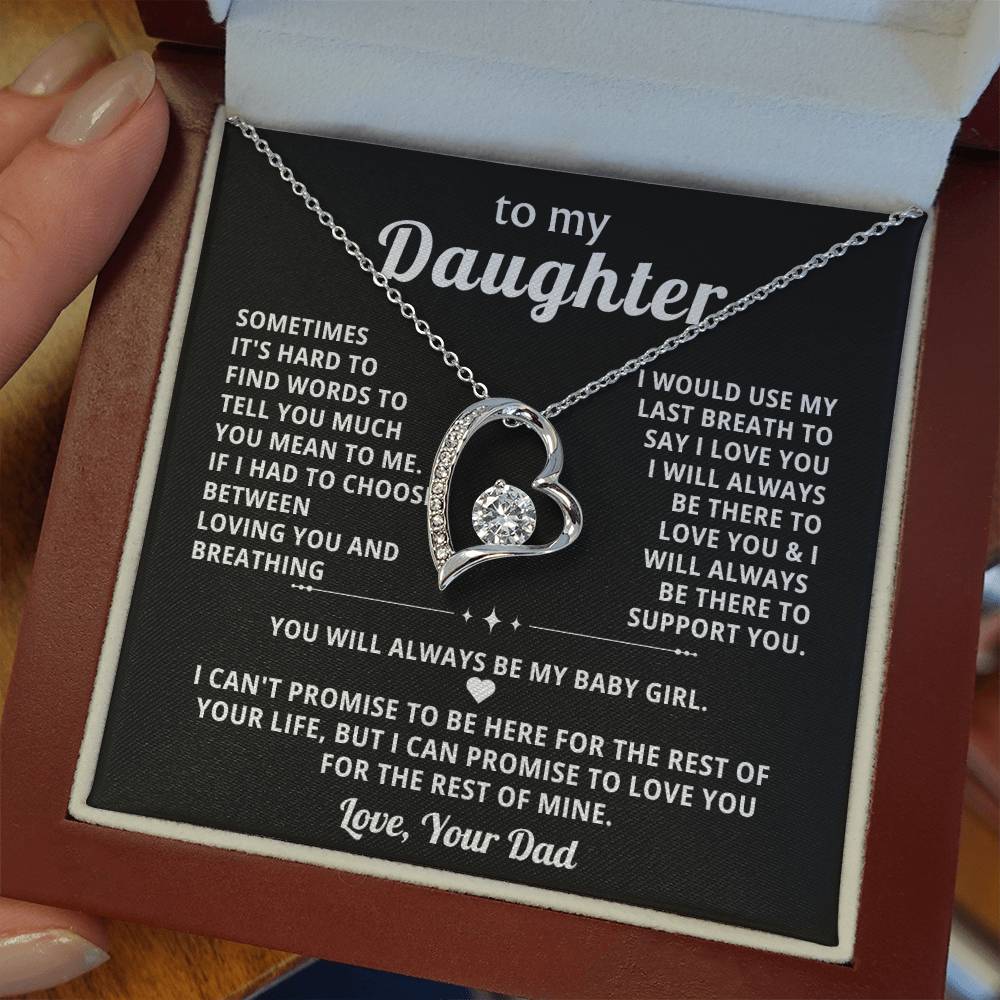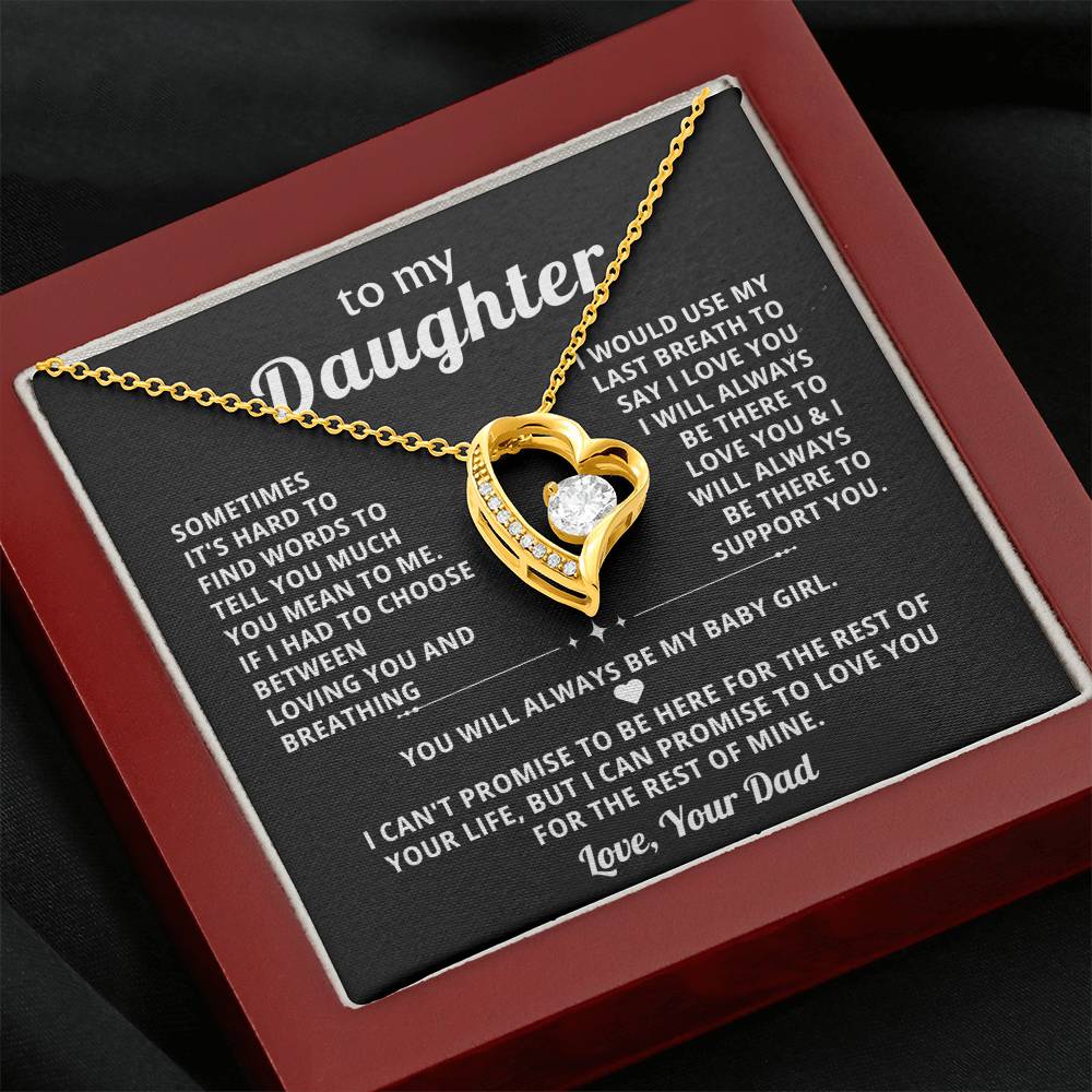 Quote On Card: To My Daughter, SOMETIMES IT'S HARD TO FIND WORDS TO TELL YOU MUCH YOU MEAN TO ME. IF I HAD TO CHOOSE BETWEEN LOVING YOU AND BREATHING .I WOULD USE MY LAST BREATH TO SAY I LOVE YOU . I WILL ALWAYS BE THERE TO LOVE YOU &I WILL ALWAYS BE THERE TO SUPPORT YOU YOU WILL ALWAYS BE MY BABY GIRL. I CAN'T PROMISE TO BE HERE FOR THE REST OF YOUR LIFE, BUT I CAN PROMISE TO LOVE YOU FOR THE REST OF MINE. Love, Your Dad