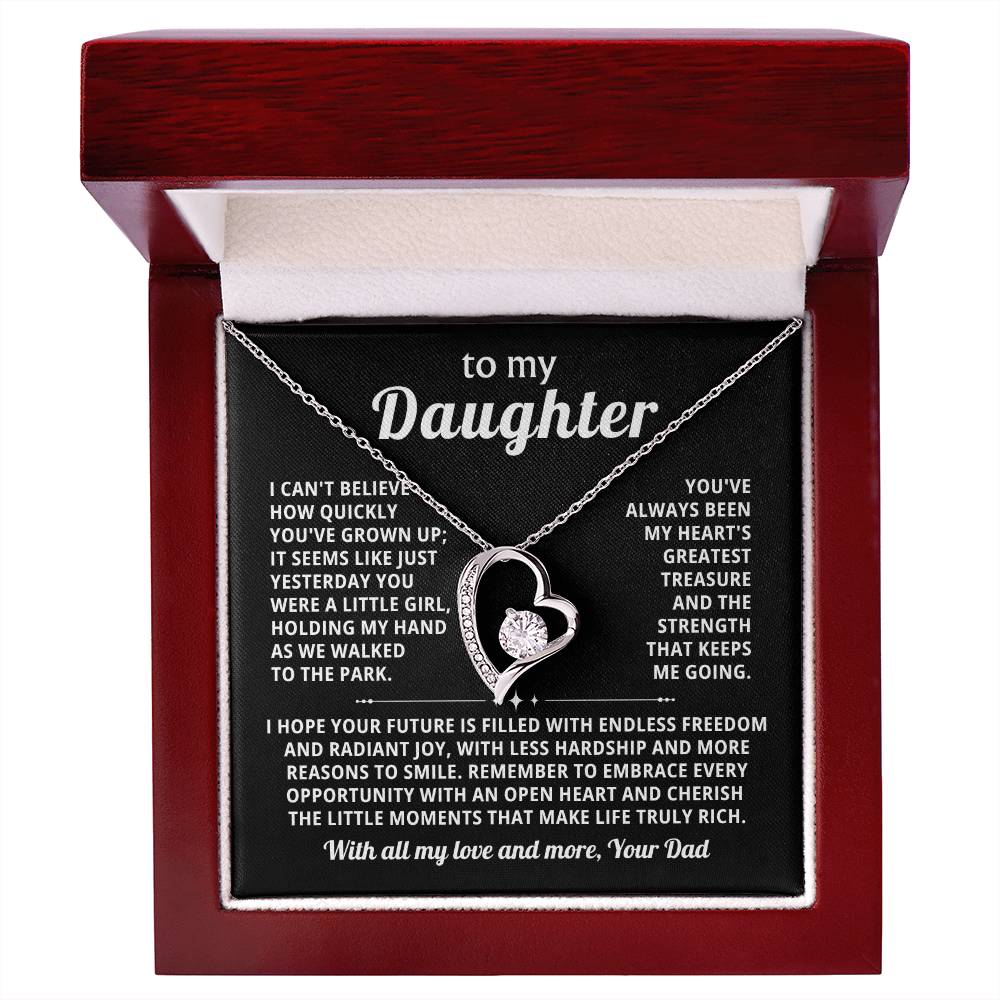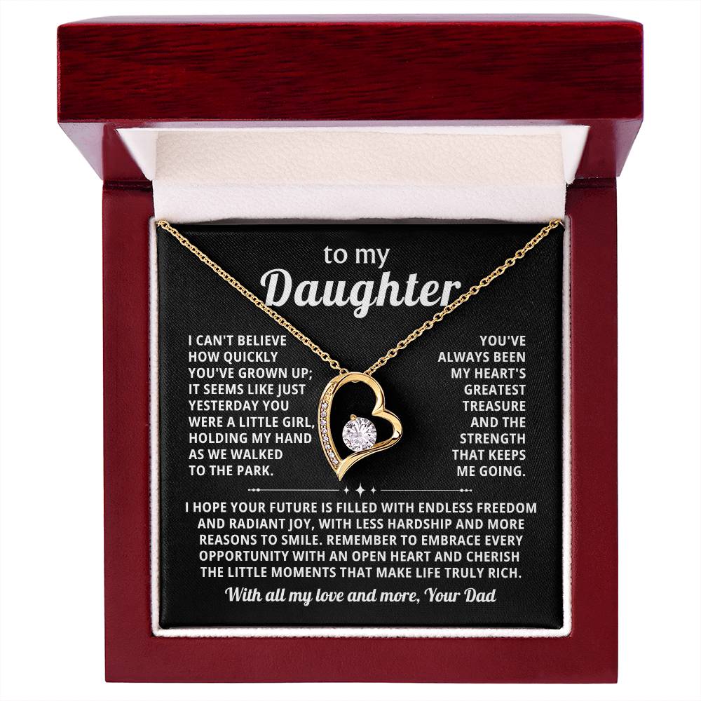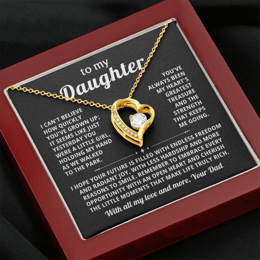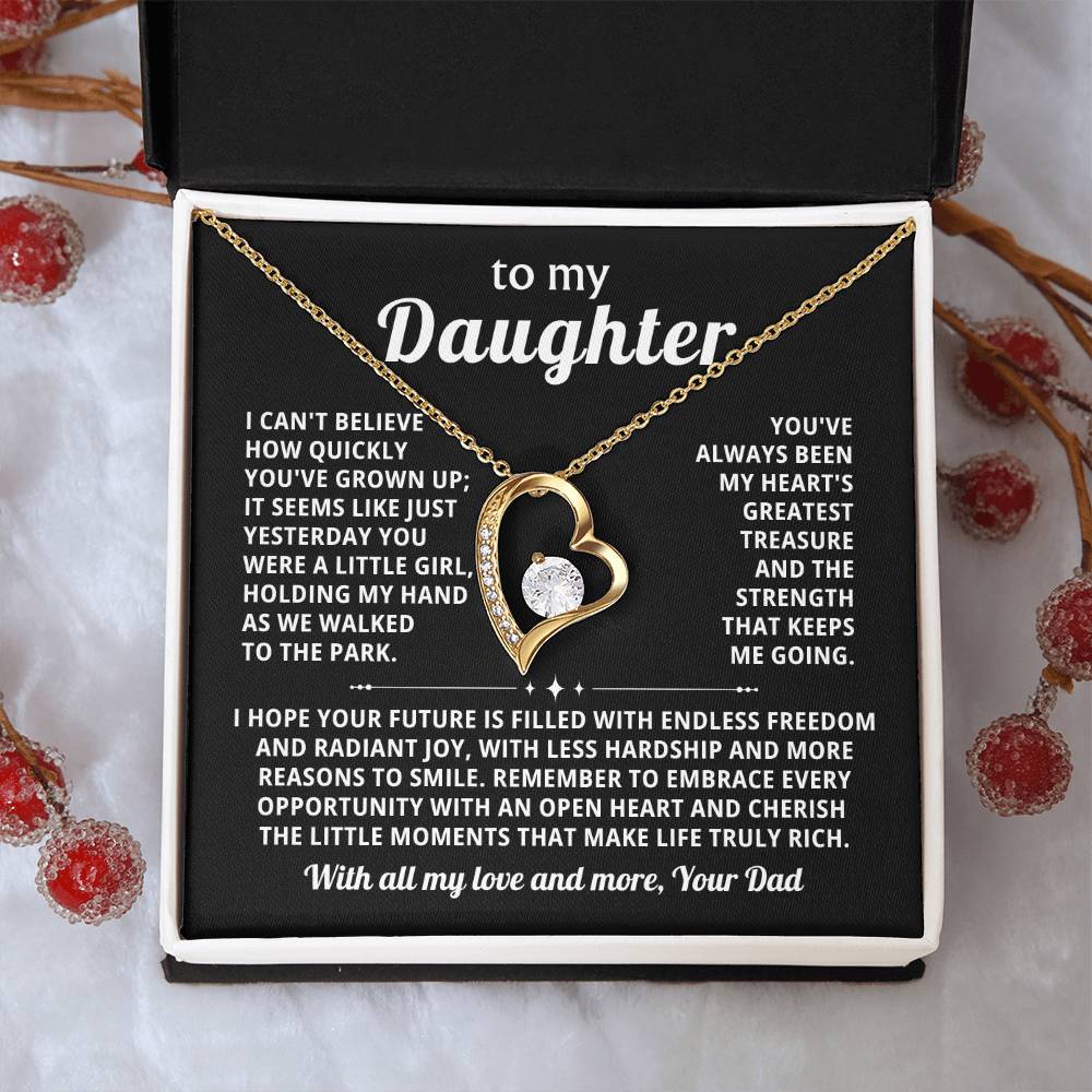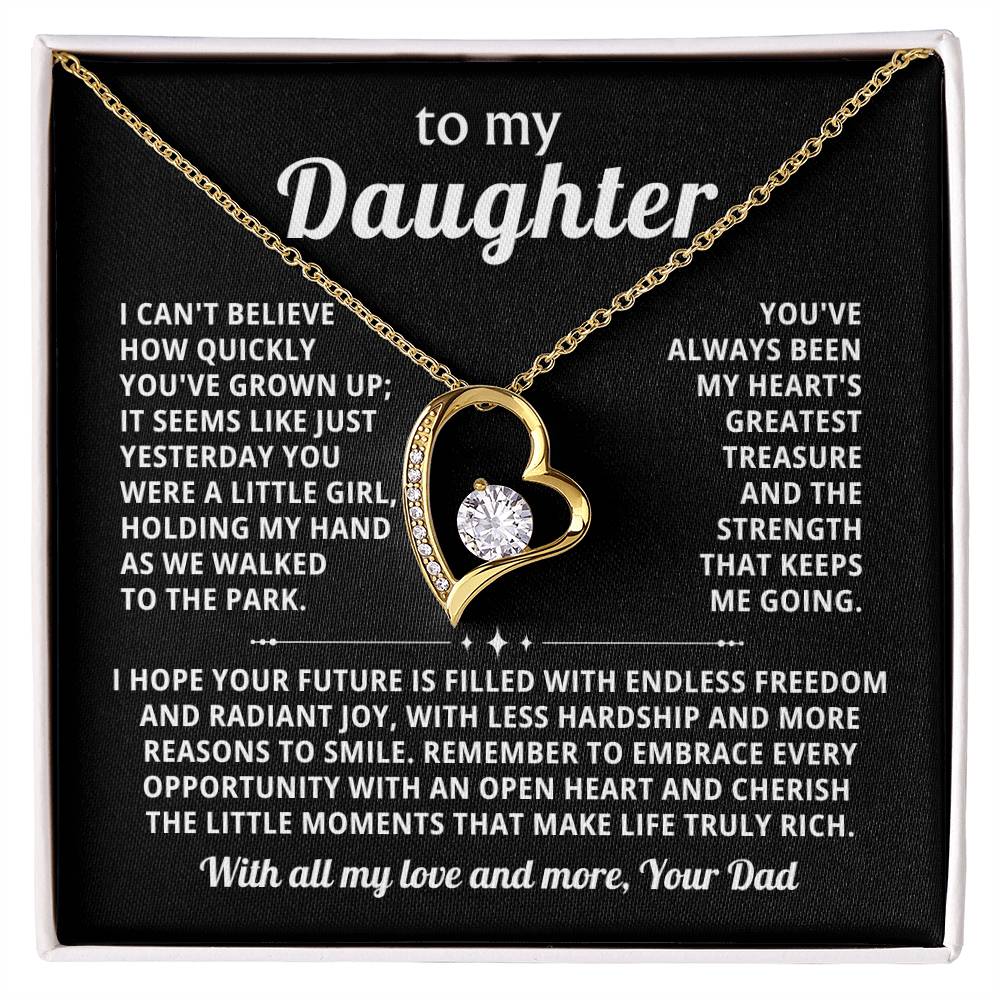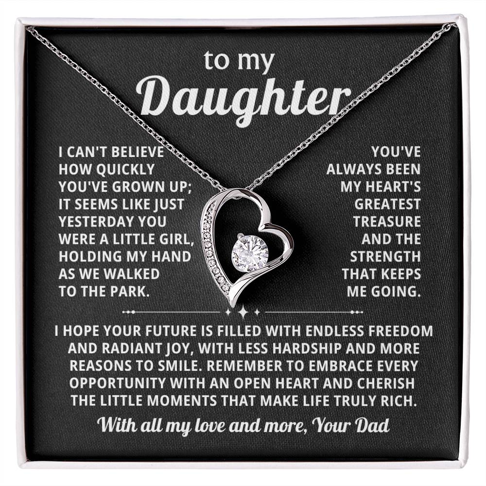Quote On Card: To my Daughter, I can't believe how quickly you've grown up; it seems like just yesterday you were a little girl, holding my hand as we walked to the park. You've always been my heart's greatest treasure and the strength that keeps me going.I hope your future is filled with endless freedom and radiant joy, with less hardship and more reasons to smile.Remember to embrace every opportunity with an open heart and cherish the little moments that make life truly rich. Love, Your Dad